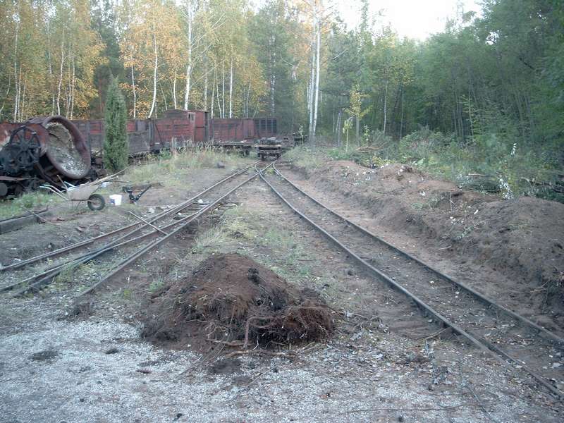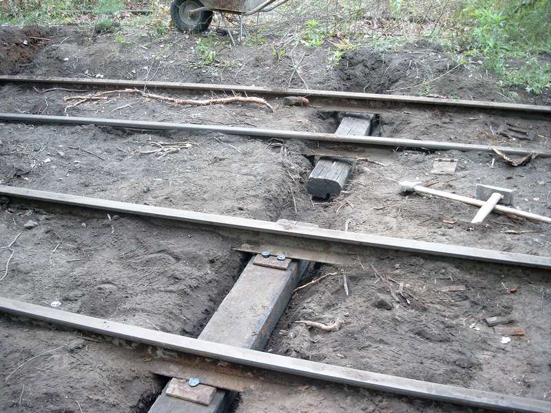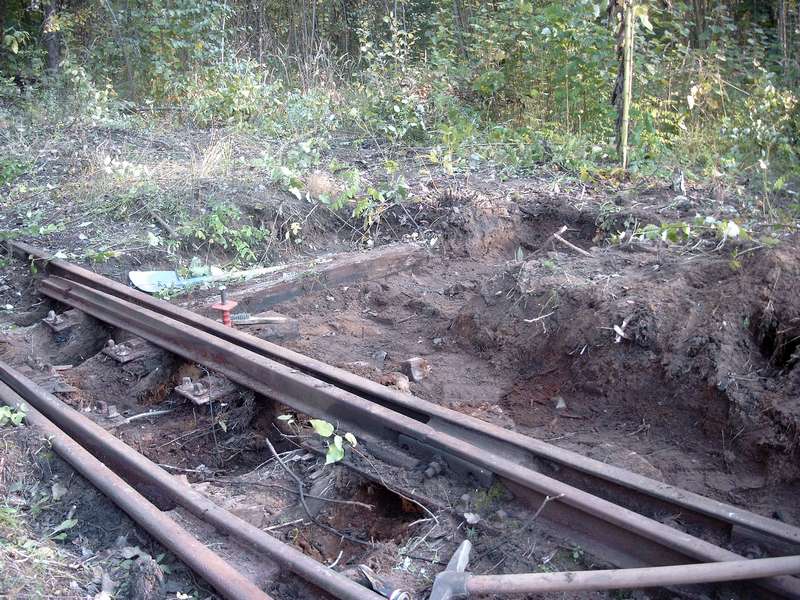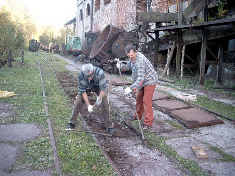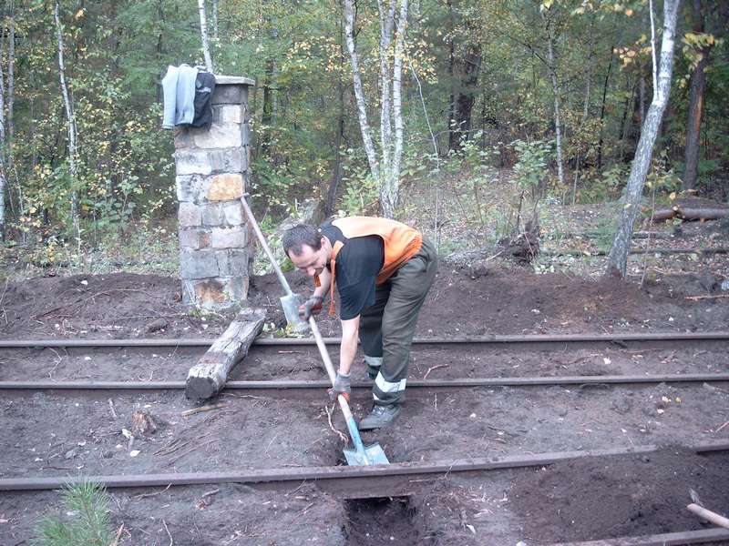 Z braku możliwości przepchnięcia dużych wagonów towarowych zająłem się dogłębnym czyszczeniem toru prowadzącego do odlewni ( bez skojarzeń proszę). Następnym zadaniem było uruchomienie rozjazdu przed halą lejniczą i wstawienie świeżo odremontowanego zwrotnika którego remont jak i 8 pozostałych zwrotników zasponsorował Kalito. Dni coraz krótsze, a roboty jeszcze dużo. Kolejne dni to prace związane z wymianą podkładów i odsłanianiem kolejnych metrów toru głównego do miejsca gdzie stały 2 parowozy. Prace były o tyle utrudnione ze oczyszczany był tor na szerokość około 1 metra od szyny. Nierówny teren jak i zasypane tory powodowały, ze średnia głębokość kopania to ½ metra. Ale jakoś sobie radziłem