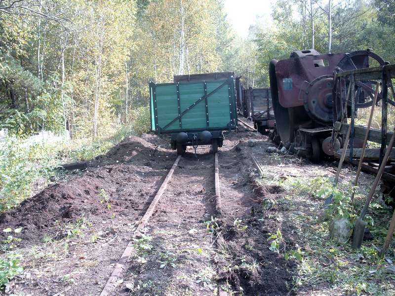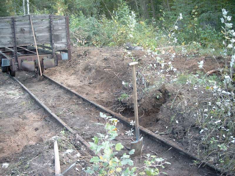 Dzień za dniem szybko mija a Ogoniasty łopata wciąż wywija. Kolejne tony ziemi odrzucone jak najdalej od toru. Aha zapomniałem dodać że musiałem podprowadzić trochę żwirku z terenu muzeum w celu przygotowania toru ekspozycyjnego na którym miał stanąć parowóz przestawiony z innego toru