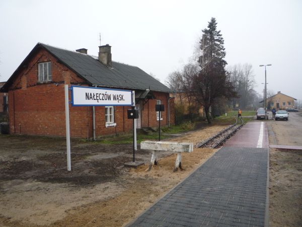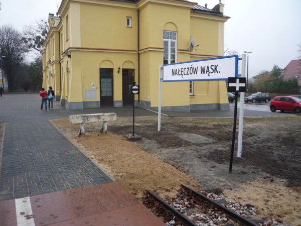 Spostrzeżenia z dzisiejszej wizyty w Nałęczowie. Od kilku miesięcy trwa remont dworca PKP S.A. w Nałęczowie. Dobiega już końca, zdaje się, że 19 listopada przewidziane jest oficjalne otwarcie. Niejako przy okazji odnowiony został peron 1 nałęczowskiej stacji, a także został zrobiony krótki peron przy wąskim torze NKD, dochodzącym niemal do dworca. Została także wykonana nowa tablica z nazwą wąskotorowej stacji (co ciekawe w dawnej kolorystyce, czarne litery na białym tle), odnowiono kozioł oporowy, pojawiła się poduszka piaskowa i nowe wskaźniki. Nawierzchnia wąskiego toru przy nowym peronie również została częściowo odnowiona. Wymieniono część podkładów, pokryto go nową podsypką. Niestety poza peronem, za przejazdem przy rampie, widać, że wąskim torem dawno już nic nie jechało...